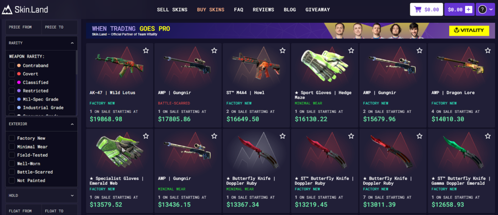 For beginners, the marketplace you pick matters almost as much as the skins themselves. Skin. Land is built to remove confusion and reduce the chance of bad buys. The interface is clean and fast, with an intuitive search, real-time pricing, clear filters, and no hidden steps during checkout.